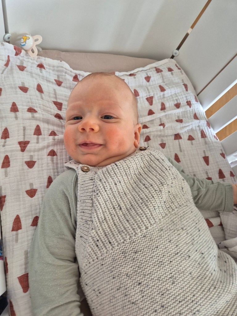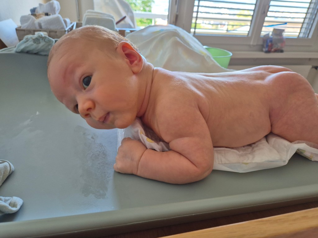 Aber mit welcher Begeisterung er heute den Schnuller im Kinderwagen angeschaut hat! Einmalig. Oder er mich morgens beim Wickeln anlacht, ich weiss nicht ob er registriert, was da gerade mit ihm passiert. Oder wie er mir beim Stillen in die Augen schaut, das ist unbezahlbar und erlebe nur ich!!!! Oder wie er den Kopf so aktiv und lange von selber hält, wenn er auf dem Bauch liegt. Die Kinderärztin war sehr beeindruckt, wieviel Kraft er hat. Und alles ist in Ordnung: Ohren, MObilität von Armen und Beinen, die Körperpflege, Haut, Kopfform (liegt viel auf dem Bauch), Gewicht & Länge hervorragend (gut entwickelt), er lächelt, liebt das Baden, machte einen ruhigen Eindruck, bis auf die Impfung, da hat er wie am Spiess geschrien, als er die zwei Spritzen bekommen hat…