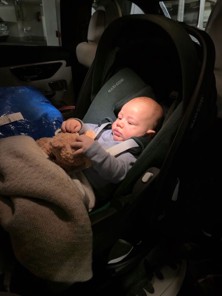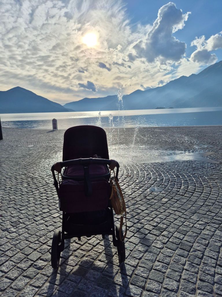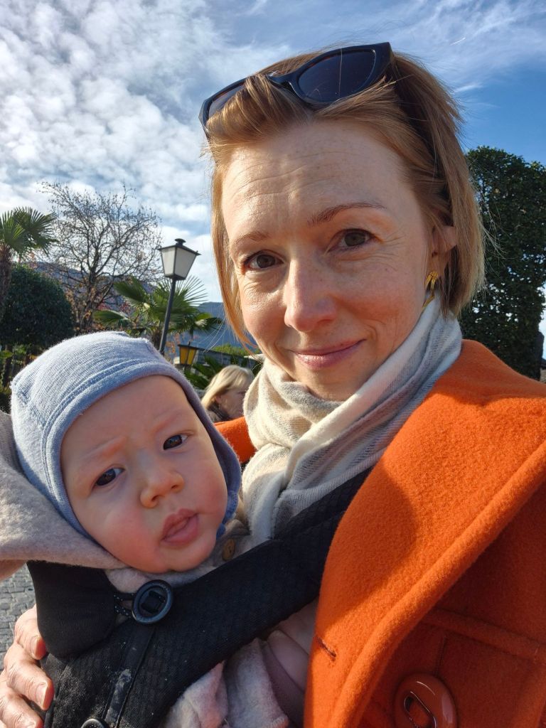 Heute sind Julian und ich nach Ascona gefahren. Meine Erkältung ist sehr hartnäckig, aber da Klaus sowieso 5 Tage in Riad ist, nutzen ich die Zeit um zu meinen Eltern zu fahren. Die Fahrt war besser als sonst, ich habe Julian ziemlich auf das Autofahren „präpariert „: im Auto hängt ein Spiegel, sodass er mich theoretisch sehen kann und ich ihn. Am Spiegel hängen zwei Fotos von Klaus und mir 😄 auf die Teddy-Spieluhr habe ich einige Tropfen von meiner Muttermilch geträufelt.