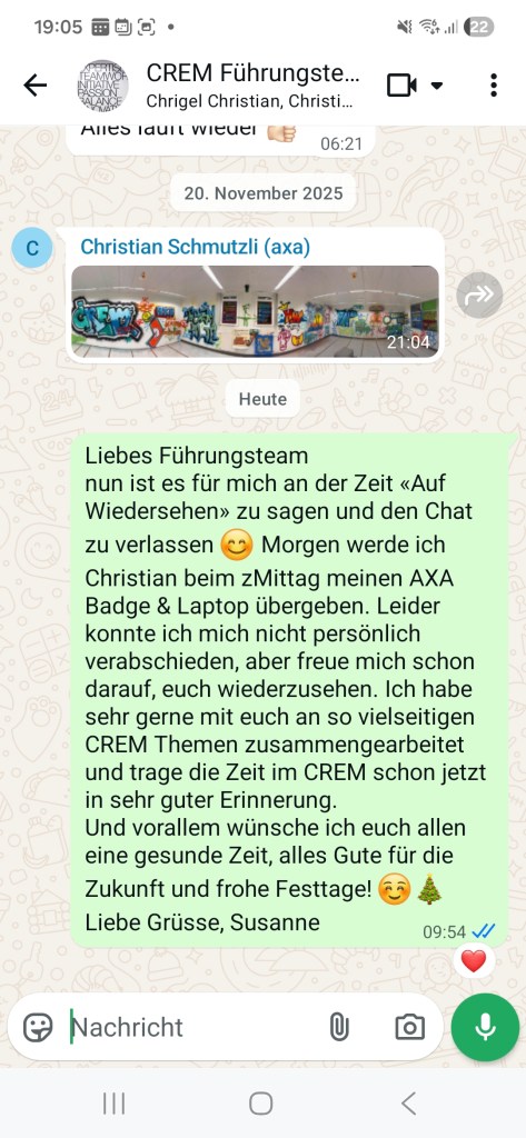 - beim Verabschieden hat sich Christian 3x umgedreht und Julian & mir gewunken. ich glaube, er vermisst die Zusammenarbeit mit mir wirklich… (meine Nachfolgerin hat er wieder rausgeschmissen, weil sie ihm zu ähnlich wäre und nicht genau arbeitet).