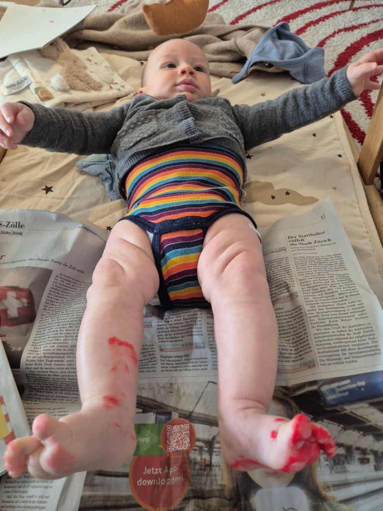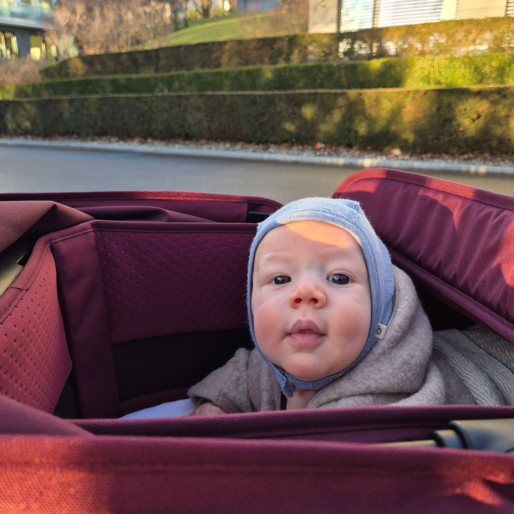 4 Monatskontrolle bei der Kinderärztin und Tetanusimpfung. Er schreit wie am Spiess aber beruhigt sich danach sehr schnell. Er war recht übermüdet, weil er vorher nicht mehr schlafen konnte. Die Ärztin ist sehr zufrieden, Gewicht und Körperlänge verlaufen synchron (top 3% 😄), Kopfumfang i.O. und er ist gross, so wie seine Eltern 😊