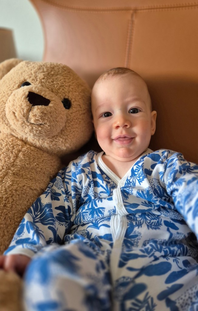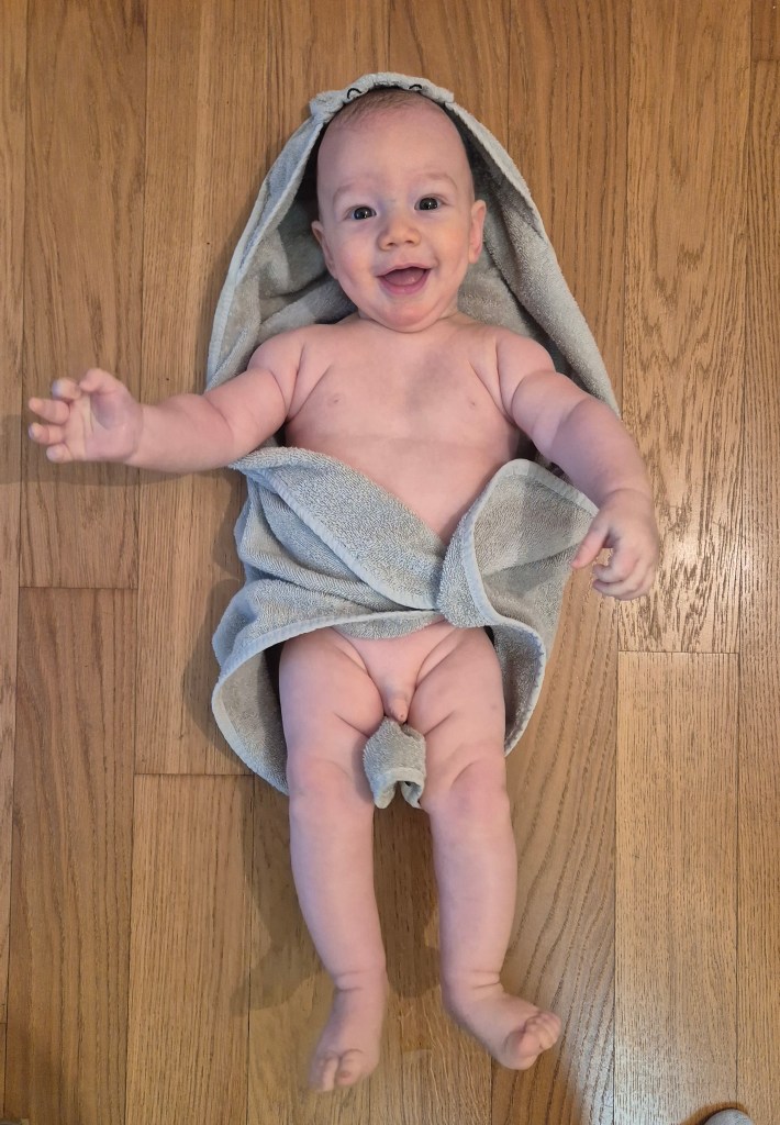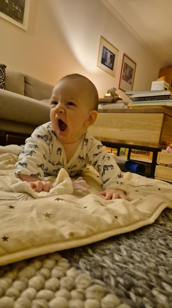 Seit ein paar Tagen rollt sich Julian vom Rücken auf den Bauch und wieder zurück, sogar im Schlafsack! Das ist neu. Und wir müssen uns langsam um die Zahnpflege kümmern, unten ist der erste Zahn draussen.