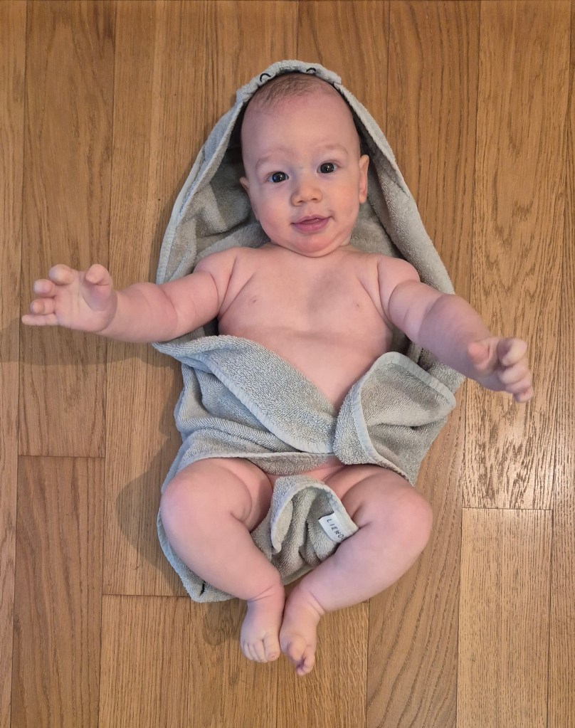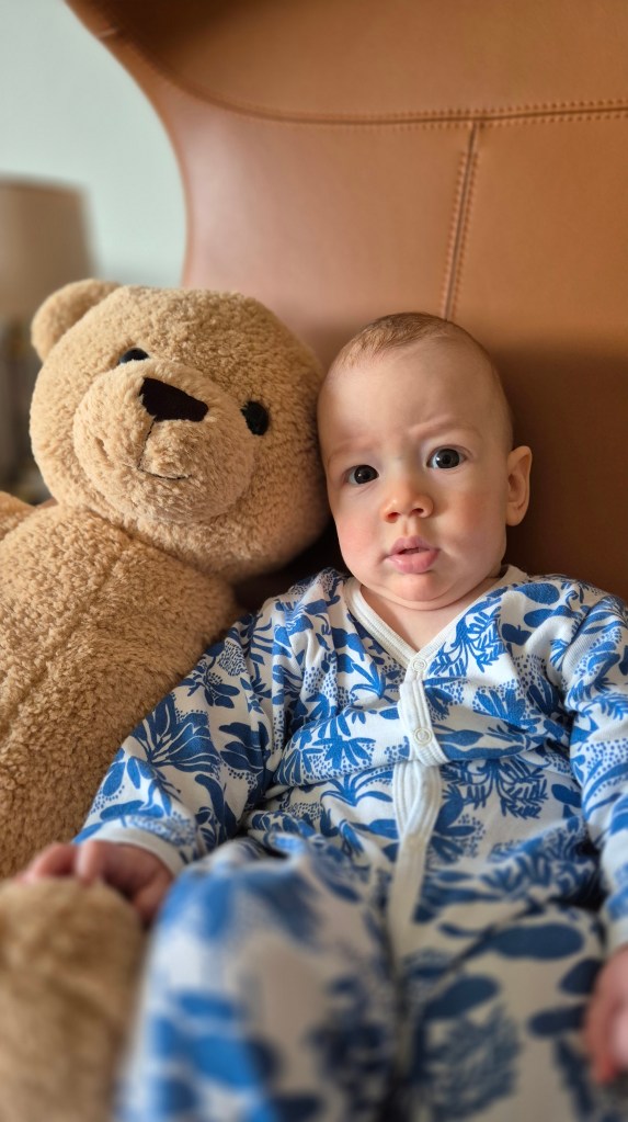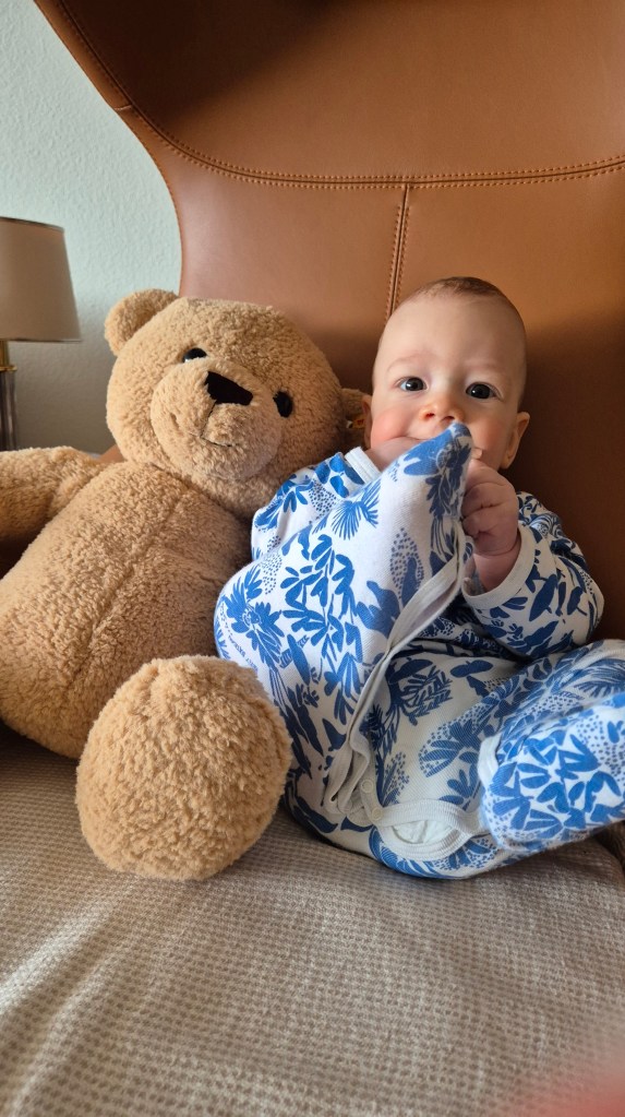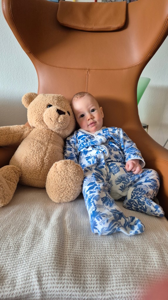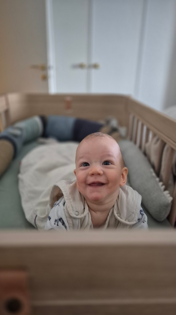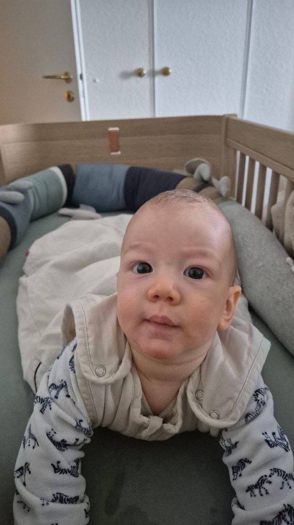 Ansonsten schläft er mir oft an der Brust ein, er hat einen hohen Kalorienbedarf, ist ein wenig anhänglich zrurzeit, aber eigentlich gut gelaunt. Er möchte so viel sehen, deswegen verrenkt er sich in der Trage immer, weil er nichts mitbekommt, wenn er nur mich anschaut 😀 Und man kann ihn so schön zum Lachen und Glucksen bringen, das ist so lustig!!