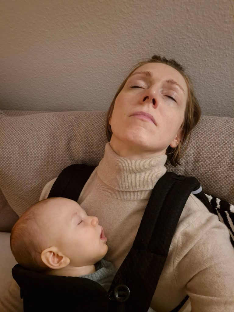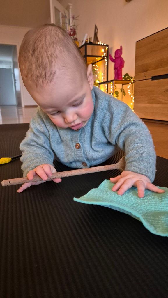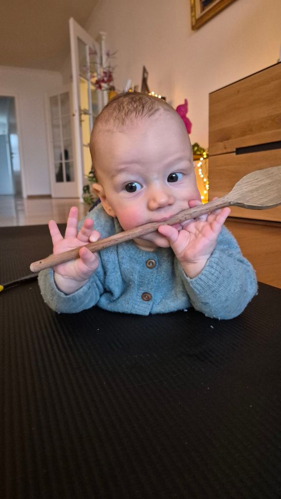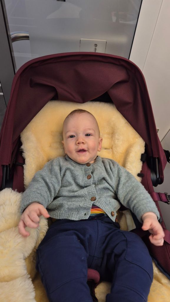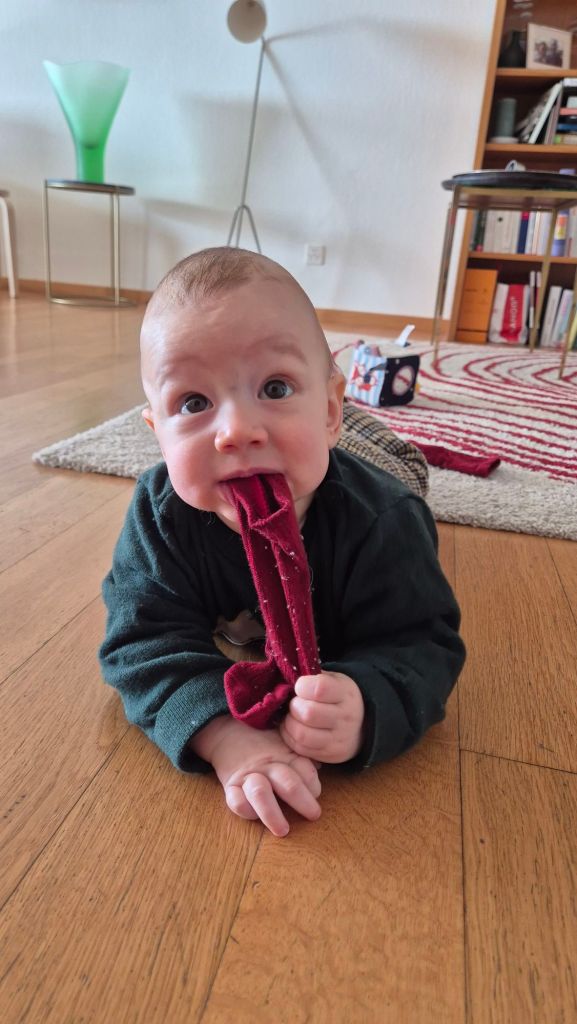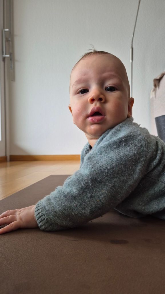Julian dreht und rollt sich hin und her, das ist echt lustig. Auch im Wollwalk und Schlafsack.