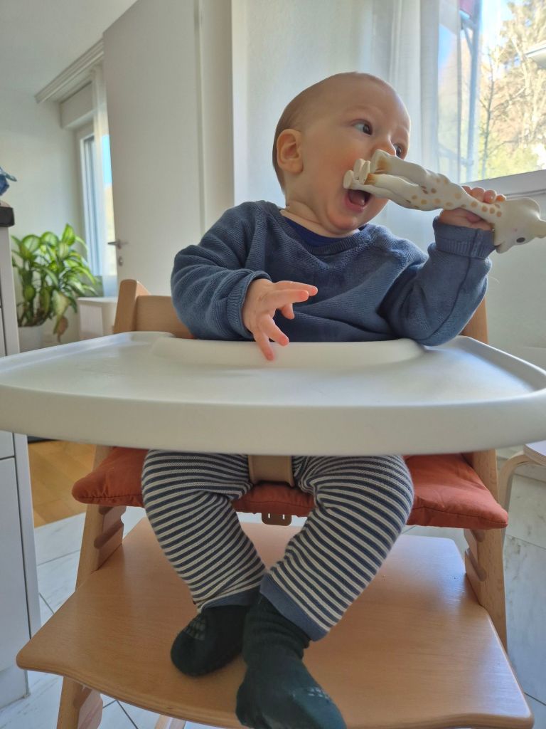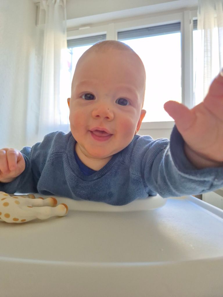 Später gab es das zweite Brei Mittagessen für Julian. Er hat einige Löffel gegessen, leider ohne Latz und ich hab den Pulli ruiniert.