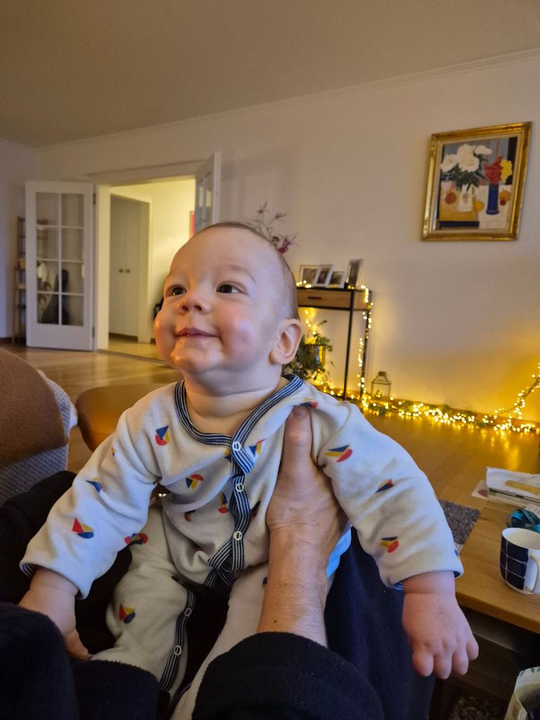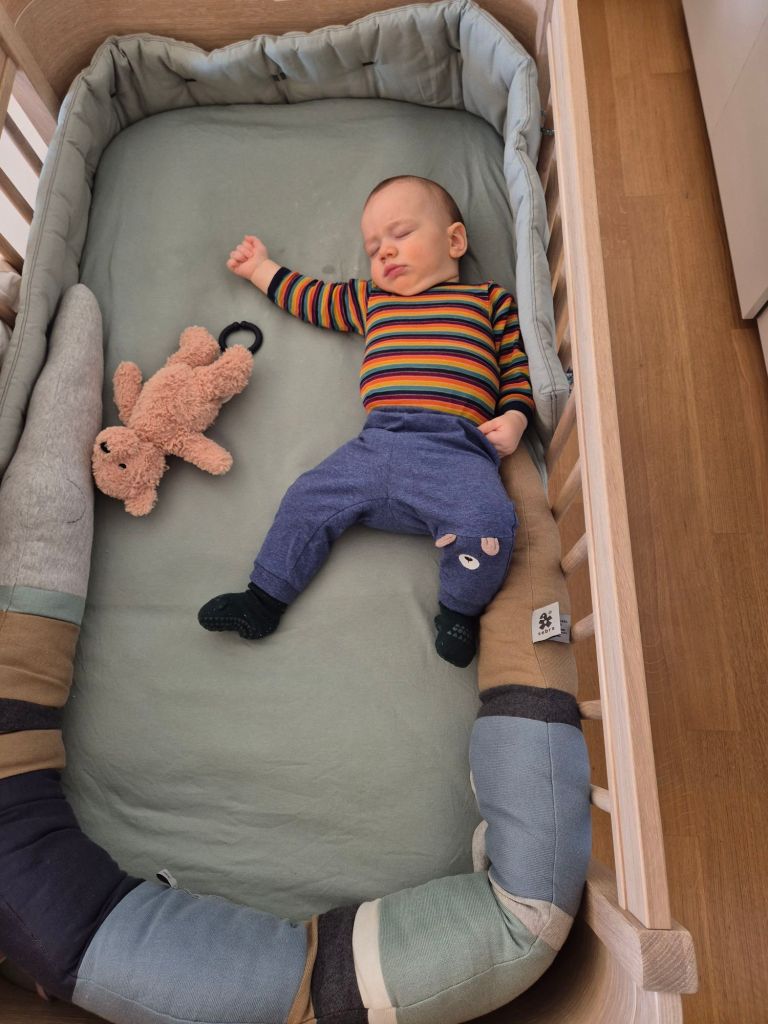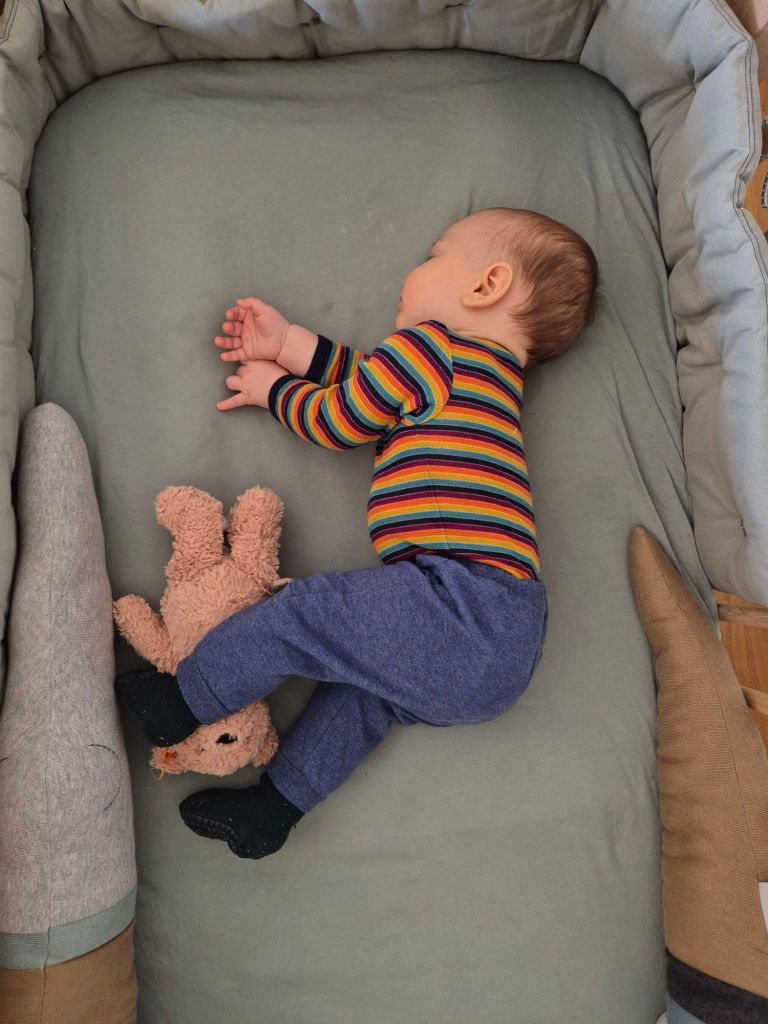 Den Abend brei Hirse-Apfel hat er kaum gegessen. Dafür funktioniert unser Einschlafritual richtig gut, dh ich trage ihn zuerst senkrecht herum, dann lege mich mit ihm ins Bett, beschäftige ihn, stille ihn, singe, lese nebenbei und kuschel mit ihm. Irgendwann schläft er dann mit einem Lächeln im Gesicht ein und wacht dann auch nicht mehr auf. Vorher hatte er nach ca 1 Std im Schlaf geweint, dass passiert momentan gar nicht mehr.