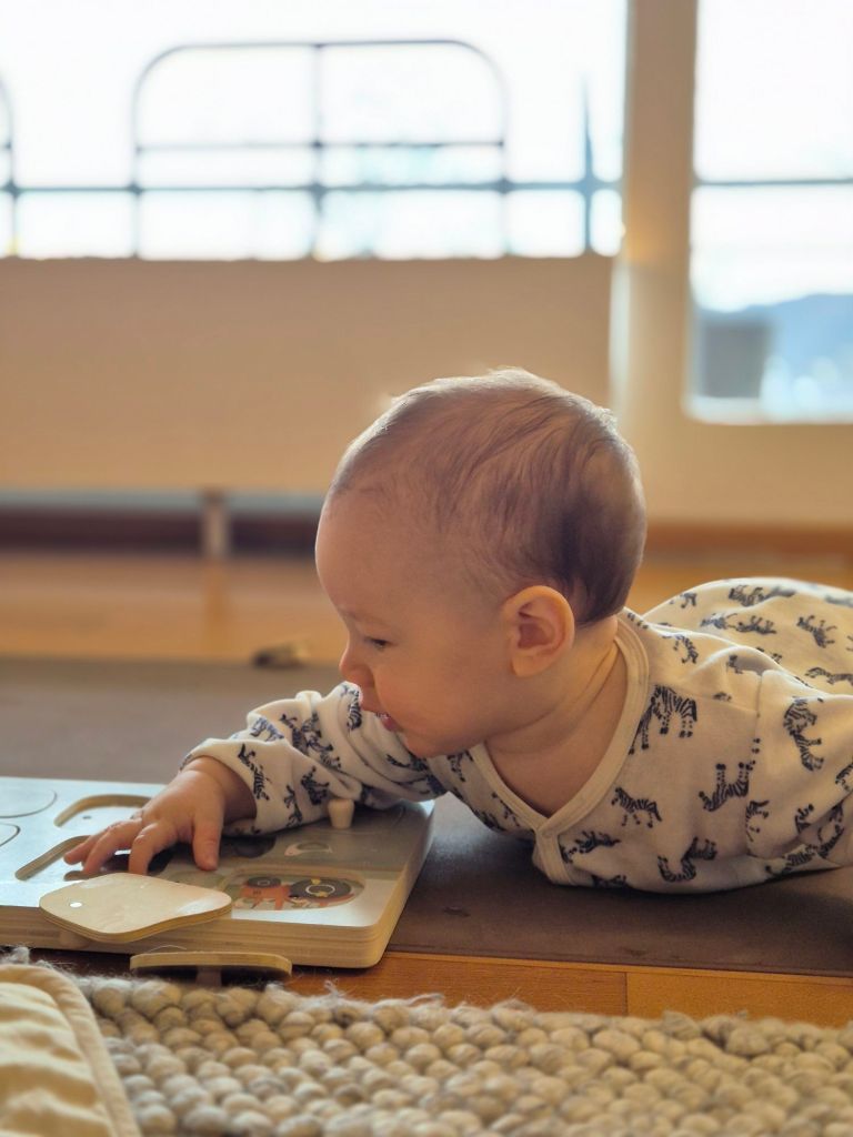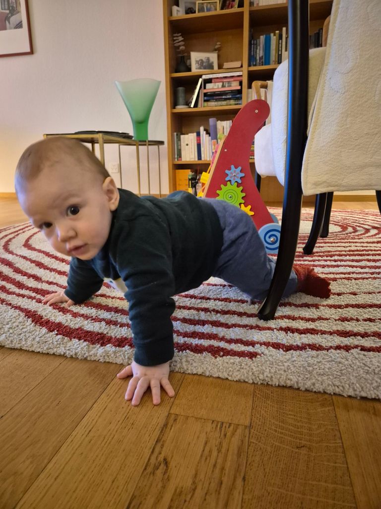 Er schiebt sich gern rückwärts, spielt unglaublich gern mit dem Bauernhof-Steckspiel und dem Waldtier-Geräusch-Buch und wenn er an einem Stuhl hängen bleibt, ist erstmal Geschrei. Tagsüber schläft er teilweise 4×30 Minuten. Die Familienberatung der Stadt Zürich sagt, dass das gut ist, wenn er den Schlaf braucht. Und das Augen und Nase reiben beim Brei essen sagt nichts aus. Er würde ja schon sehr gut essen und ich würde seine Bedürfnisse sehr gut lesen können (wann hat er genug, wann Anzeichen für Hunger).