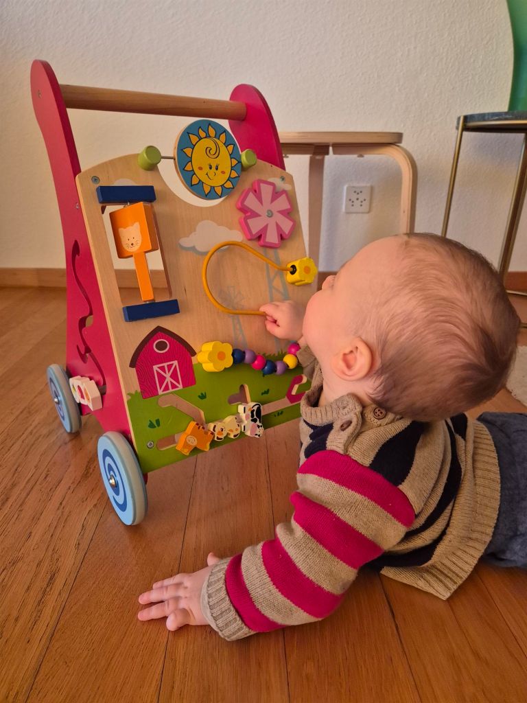 - Am Boden spielt er am liebsten mit dem neuen Lauflernwagen (im Liegen), mit dem Fühlbuch (Waldtiere), dem Aktivitätsball, dem Steckpuzzle von Robert (das macht so viel Krach, er liebt das)