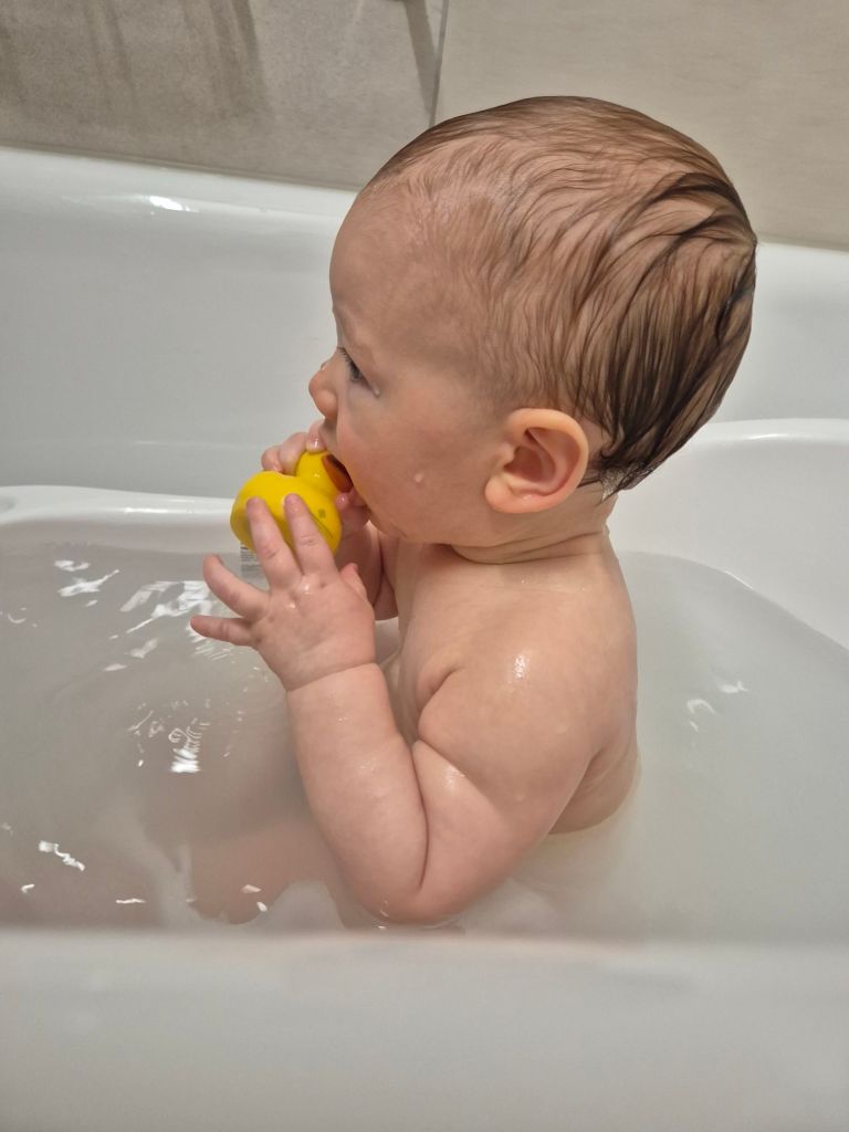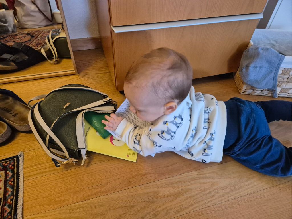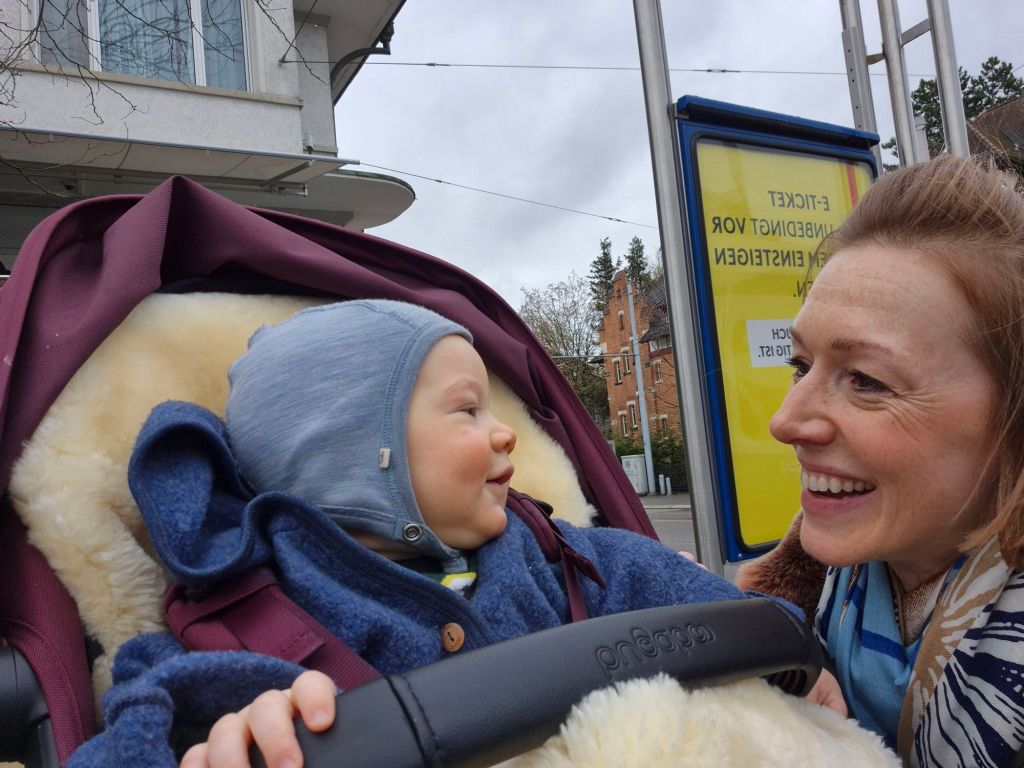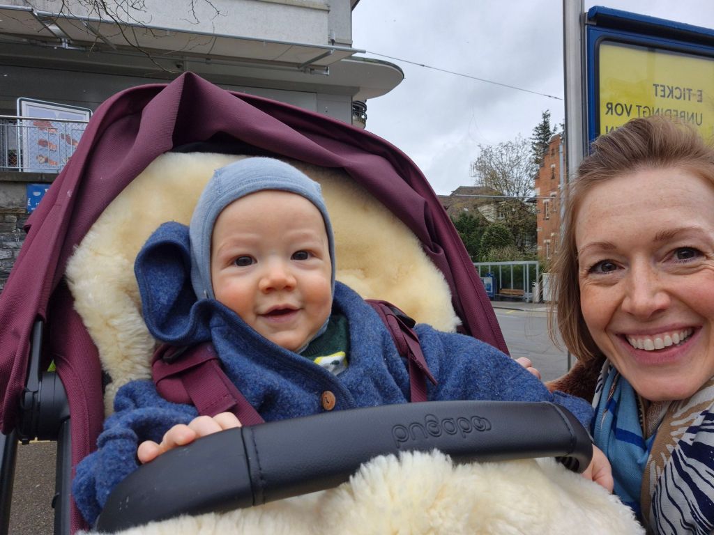 Babyschwimmen (toll wie immer!). Direkt danach Spaziergang und erst dann nach hause fahren und Mittagessen. Anschliessend einkaufen beim Reif und 1.5 h in der Trage schlafen.
