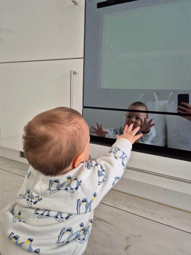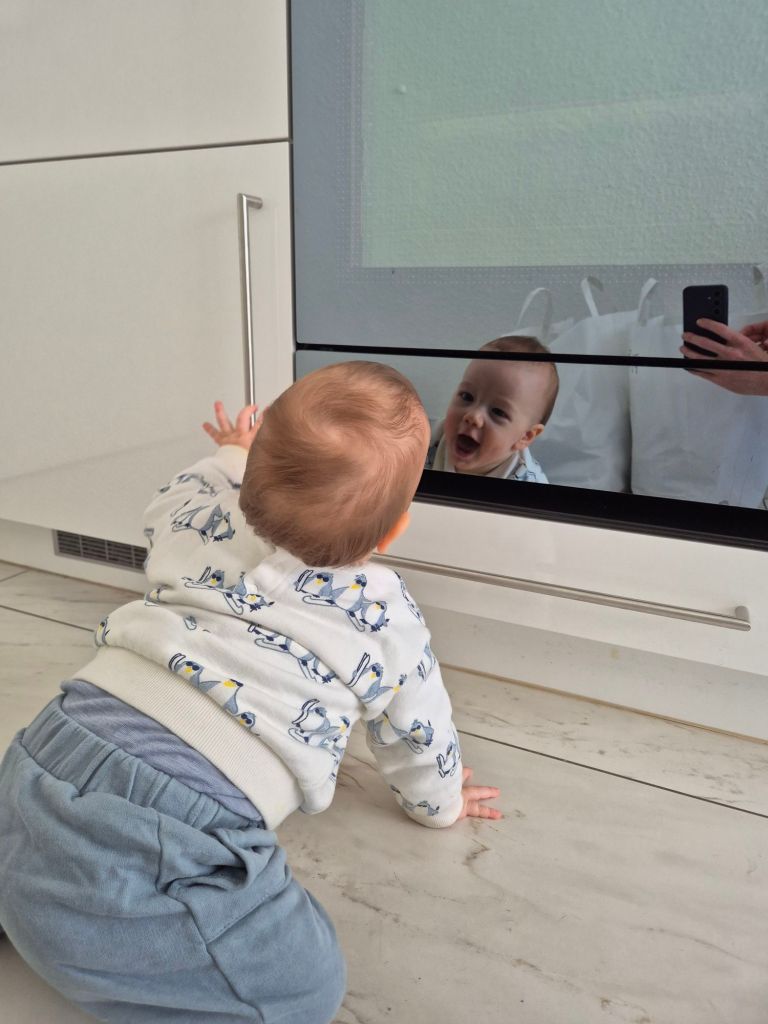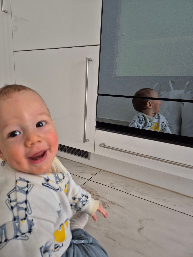 Er bewegt sich nun Selbstständig vom Sitzen ins Liegen und wieder zurück in allen Variationen und versucht ständig zu krabbeln. Er schiebt seinen Popo in die Luft und will auf den Beinen stehen, aber es klappt natürlich nicht. Ansonsten bewegt er sich im Liegen hervorragend vorwärts!