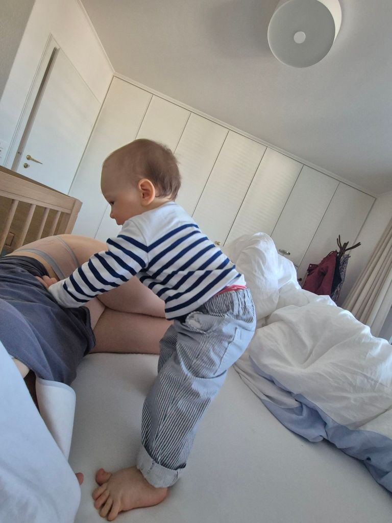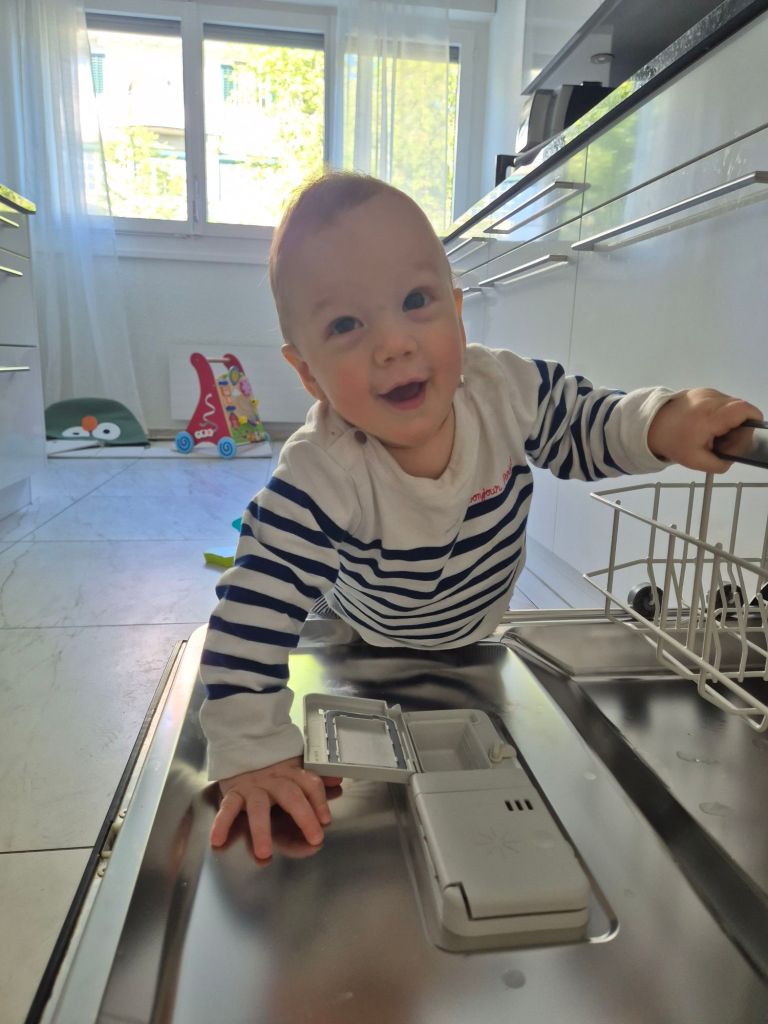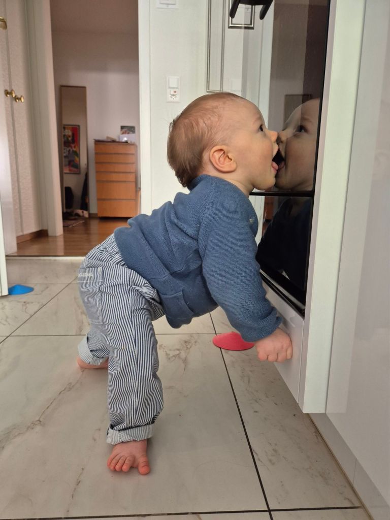 Und zuhause versucht er bei jeder Gelegenheit aufzustehen oder sich hochzuziehen (am liebsten auf unseren oder der Spülmaschine oder am Steamer). Er hat einen intuitiven Drang zu laufen, dabei krabbelt er gerade mal seit 2 Wochen 😊